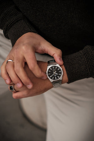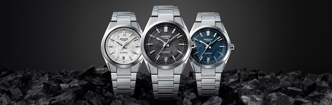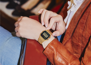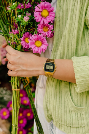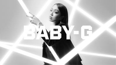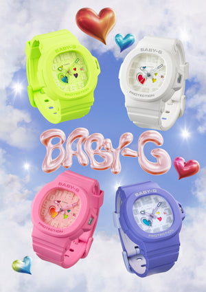 While maintaining the compact, angular style of the BGD-565, this BABY-G takes on see-through colour with a bezel and band in translucent resin and glittering dial for an added touch of luxe flair.