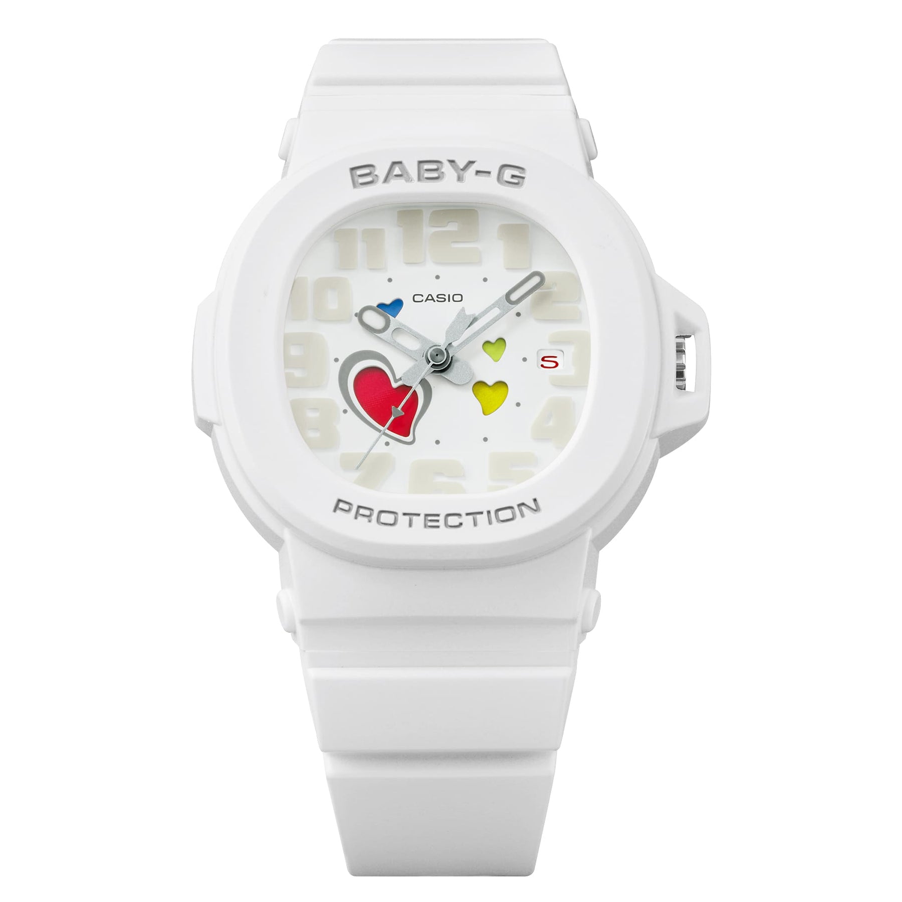 Rounded, raised Arabic numerals for an easy read and a seconds hand shaped like Cupid’s arrow piercing the hearts — these uniquely BABY-G design elements bring even more charm and whimsy to this adorable analog watch.