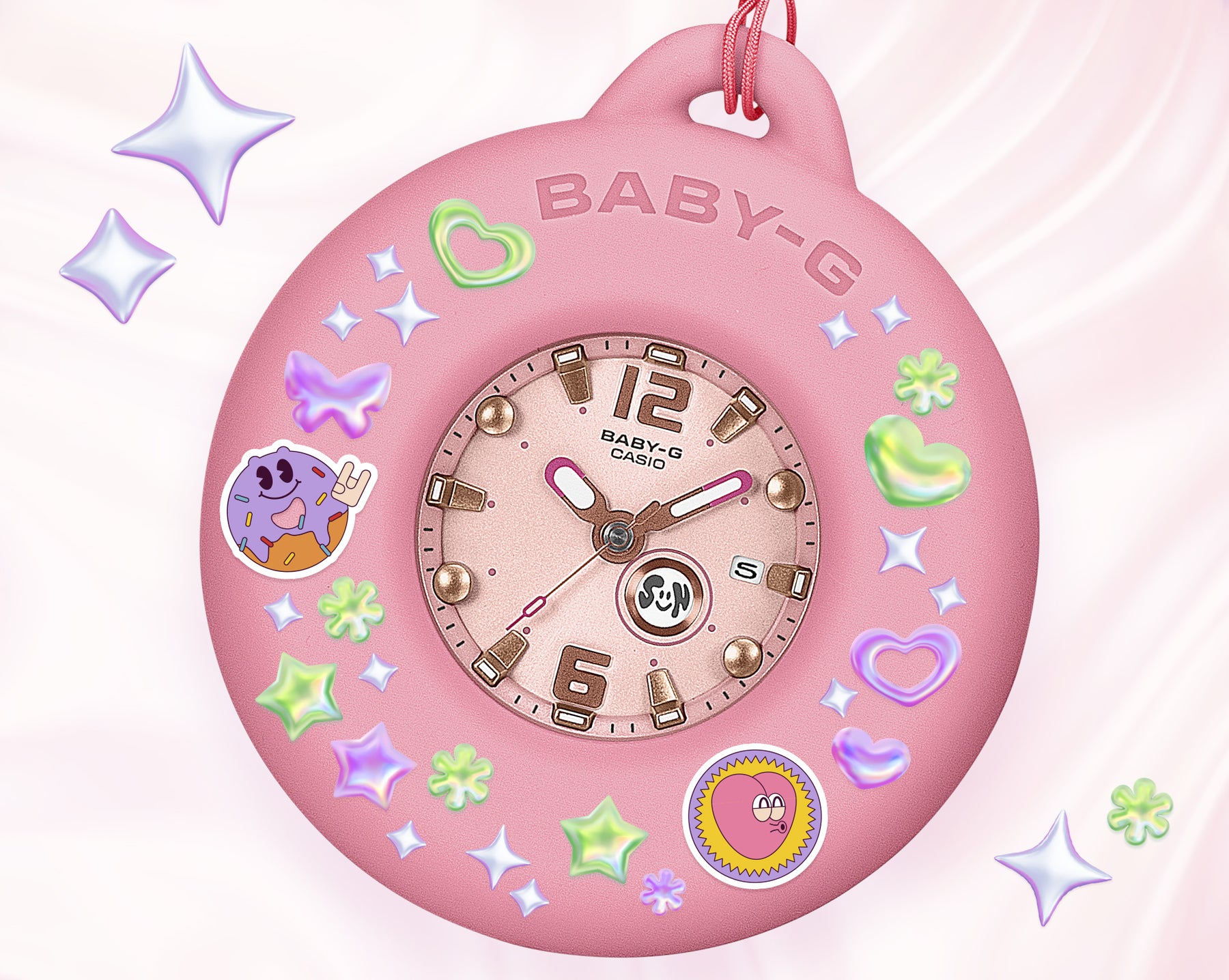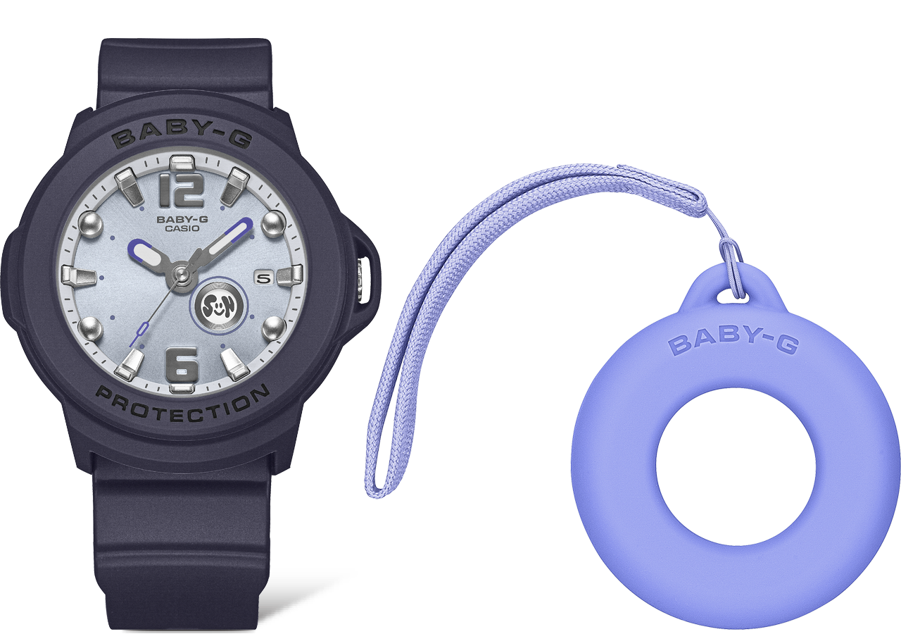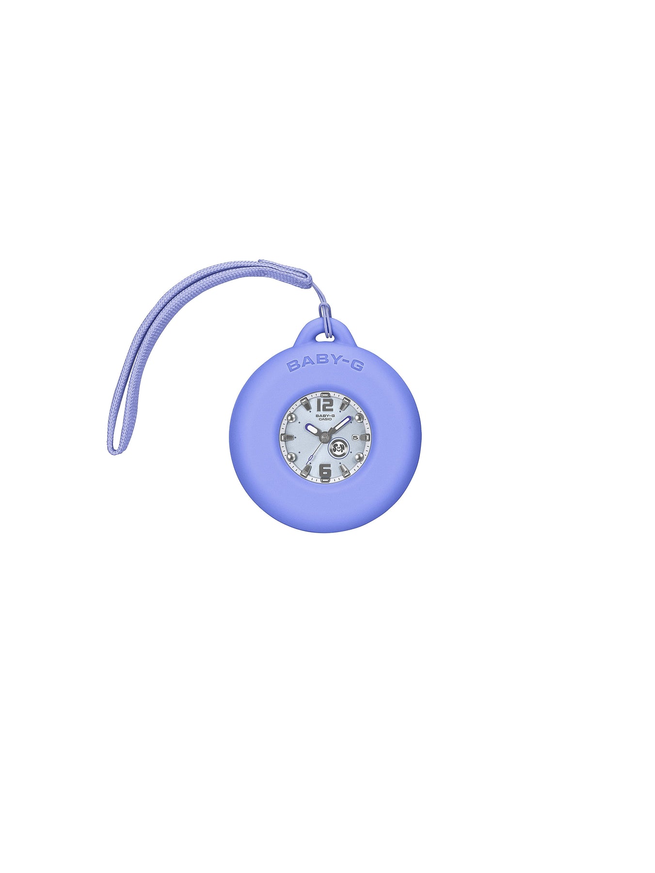 This model from the BABY-G PLUS series is a three-hand analog watch in four soft pastel colour variations. Designed for flexible styling, it can be worn on the wrist or removed from the strap and set into the included holder to be used as a unique charm.