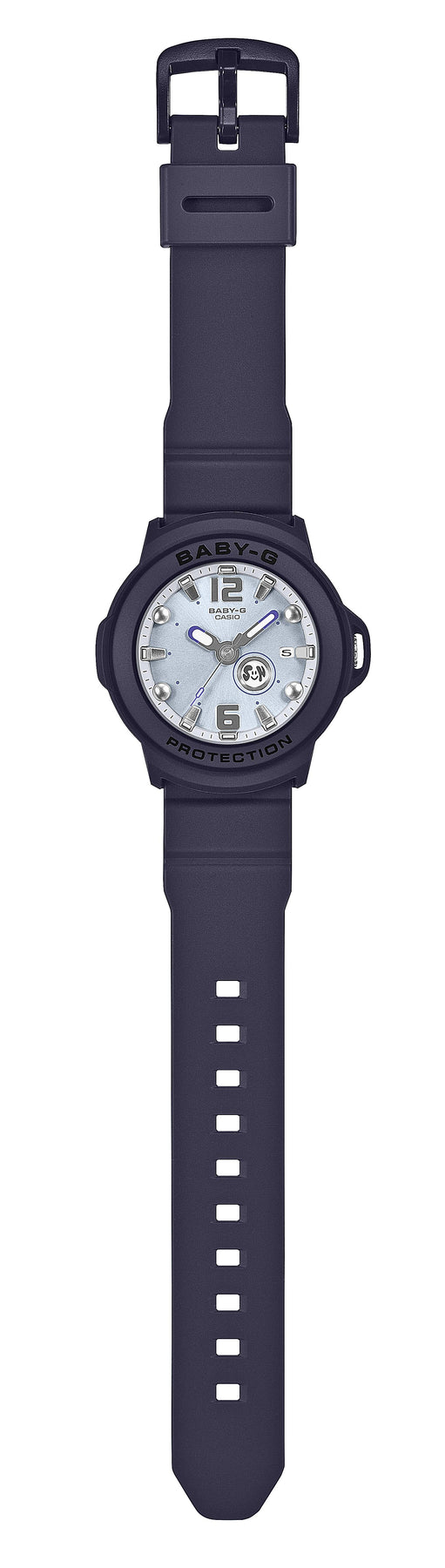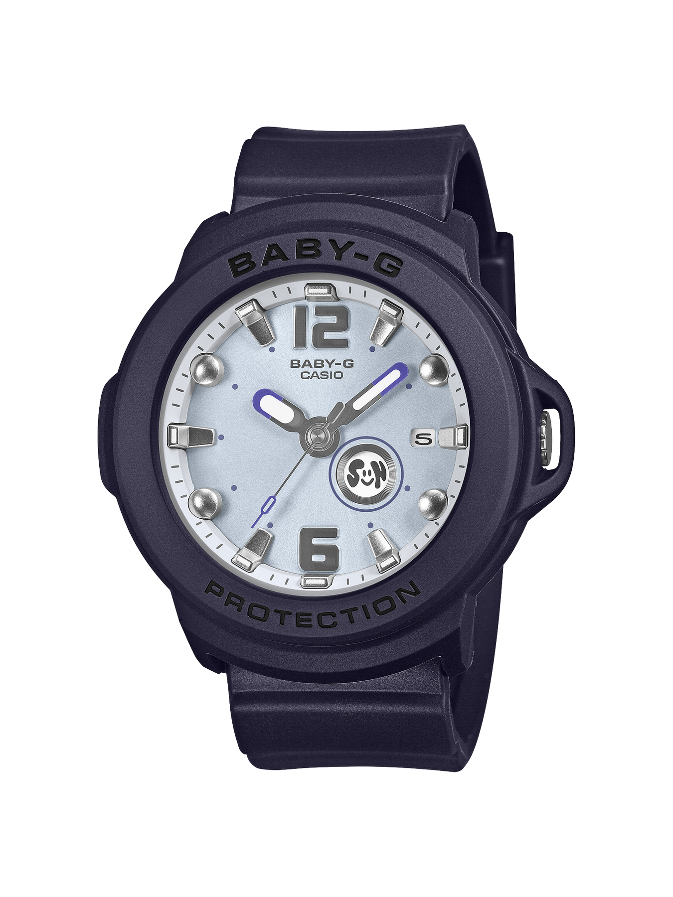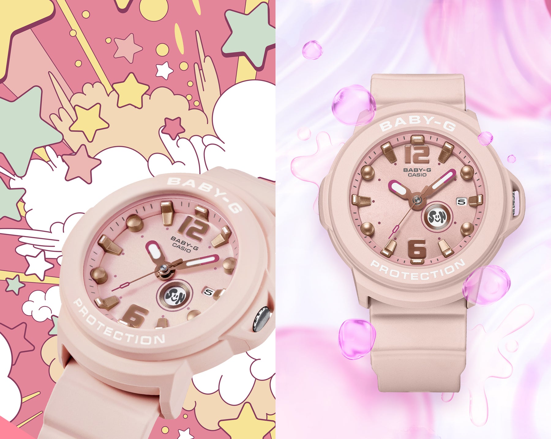 This model from the BABY-G PLUS series is a three-hand analog watch in four soft pastel colour variations. Designed for flexible styling, it can be worn on the wrist or removed from the strap and set into the included holder to be used as a unique charm.