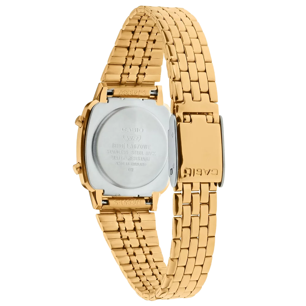 A classic watch that will stand the test of time. In an elevated gold tone, Casio presents the perfect gift or accessory your wardrobe needs. With a square face, stainless steel band and water resistance feature - Casio bridges functionality and fashion together once again.