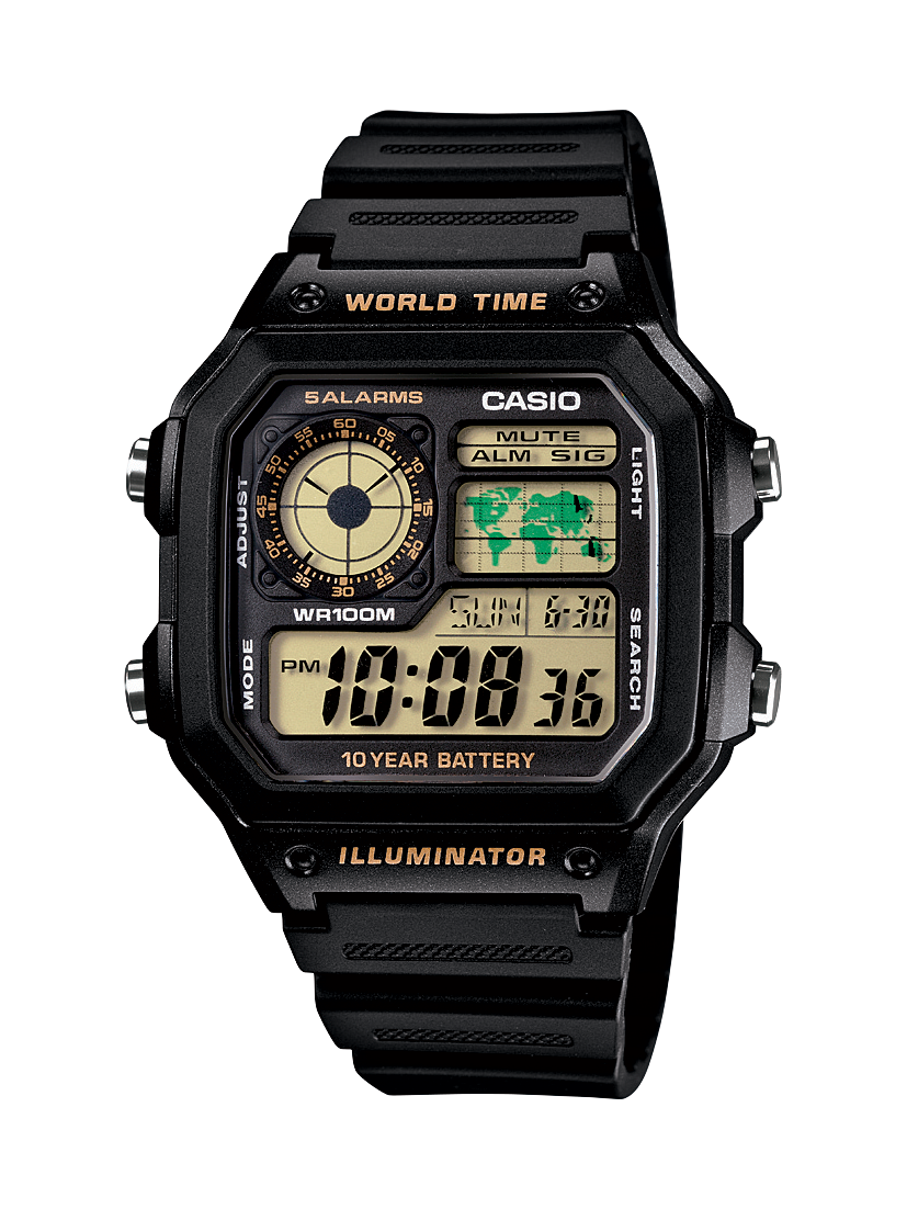 31 time zones (48 cities + coordinated universal time), daylight saving on/off, Home city/World time city swapping - 1/100-second stopwatch