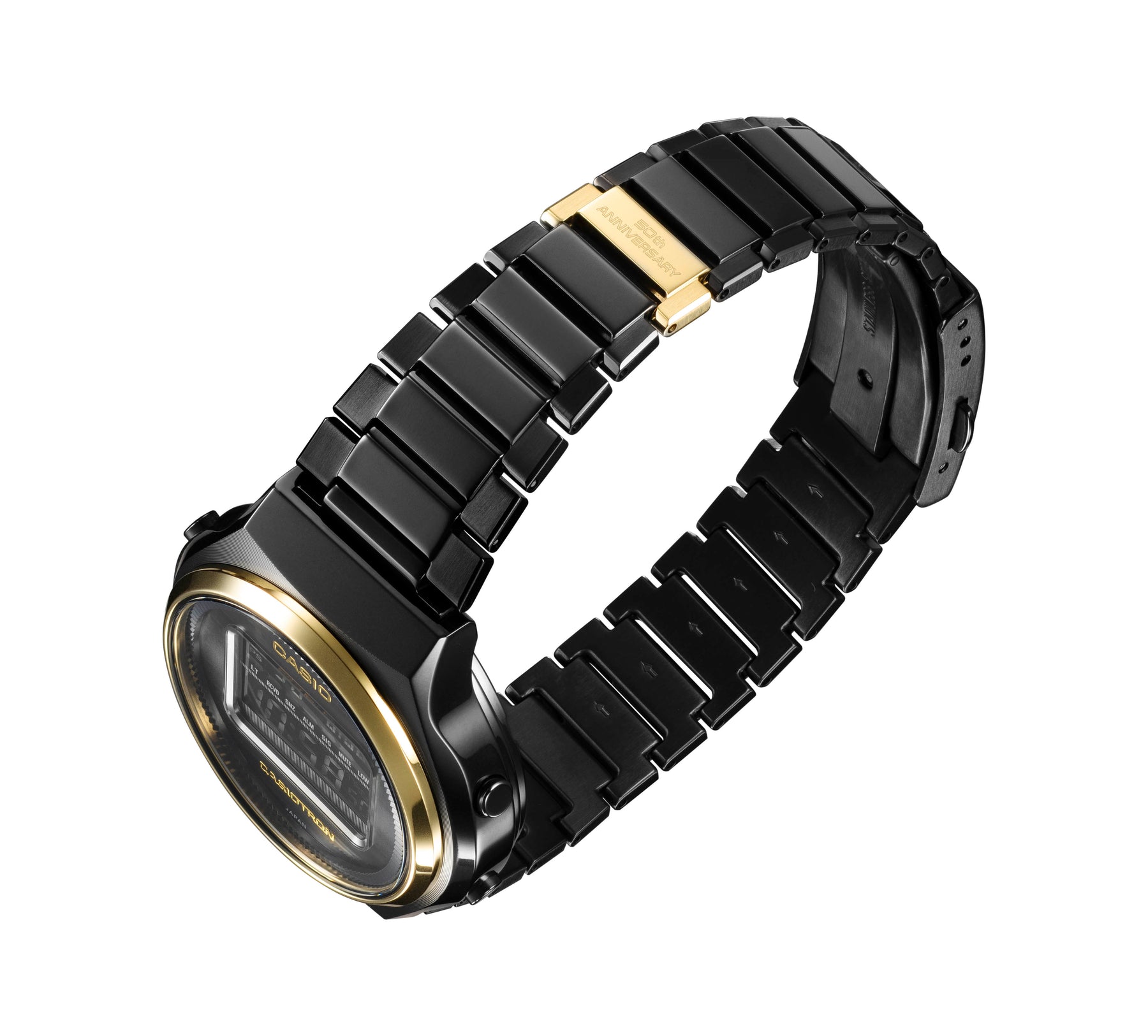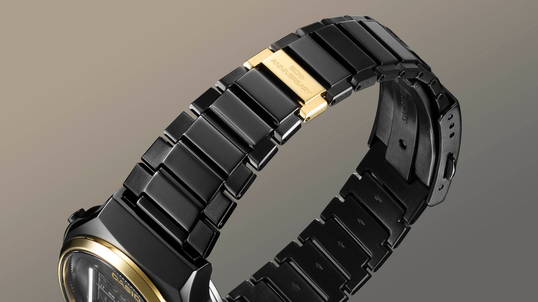 Separate hairline and mirror finishes on the stainless-steel band add sophisticated textural appeal. The single gold-colour link on an otherwise black ion-plated band is a special touch that catches the eye, flickering like a light that breaks the darkness and illuminates the path to value innovation. The link is also laser engraved with “50th ANNIVERSARY.”