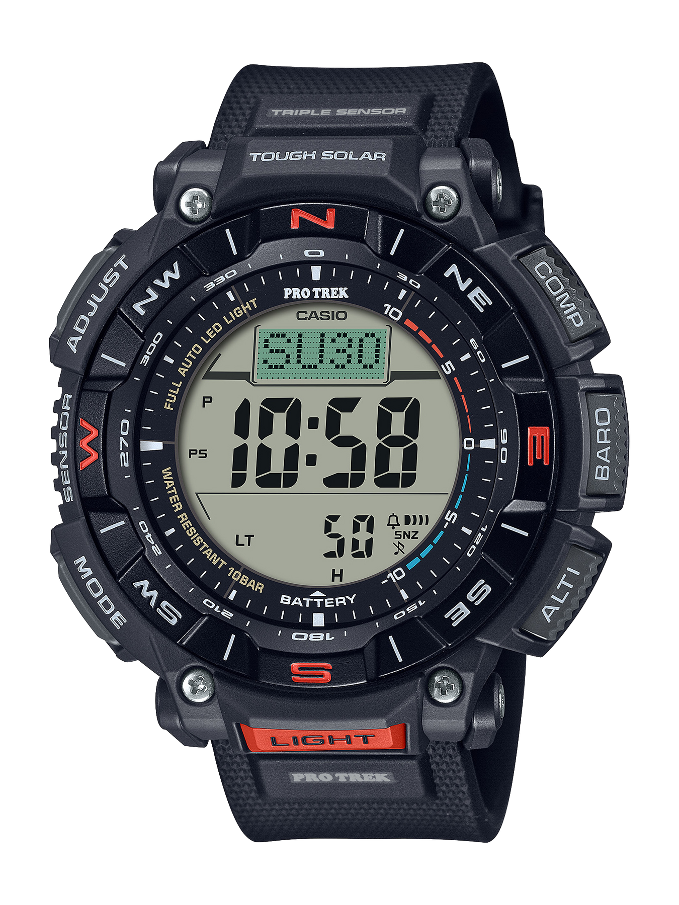 Get out into the great outdoors with a solar-powered PRO TREK featuring eco-friendly materials that care for the environment. The PRO TREK line of authentic outdoor gear for nature lovers introduces the PRG-340, a timepiece that incorporates environmentally friendly biomass plastics* while delivering the same comfortable fit for your wrist. The case and urethane band are crafted from biomass plastics made with castor oil and the band from biomass plastics made with corn.