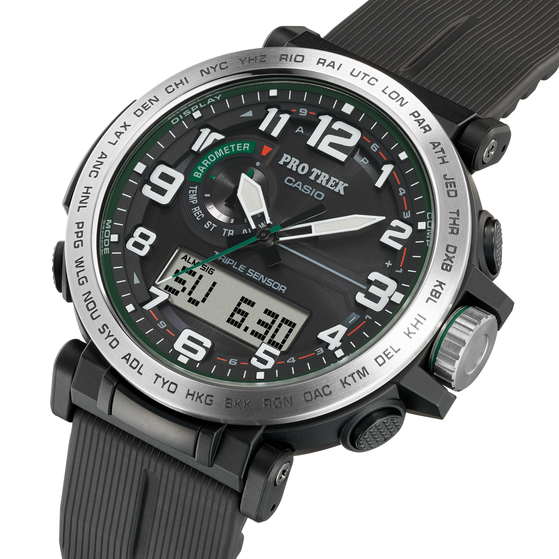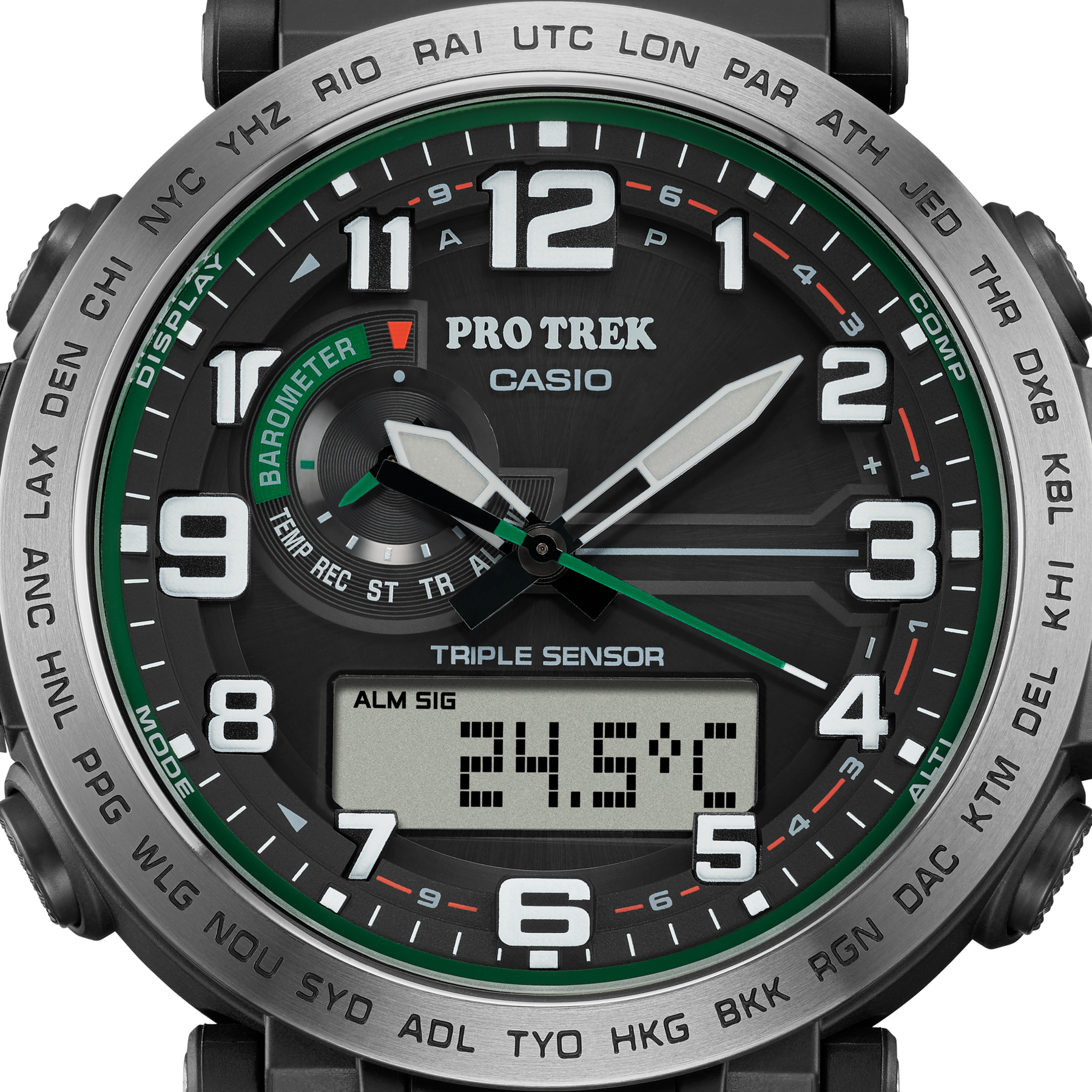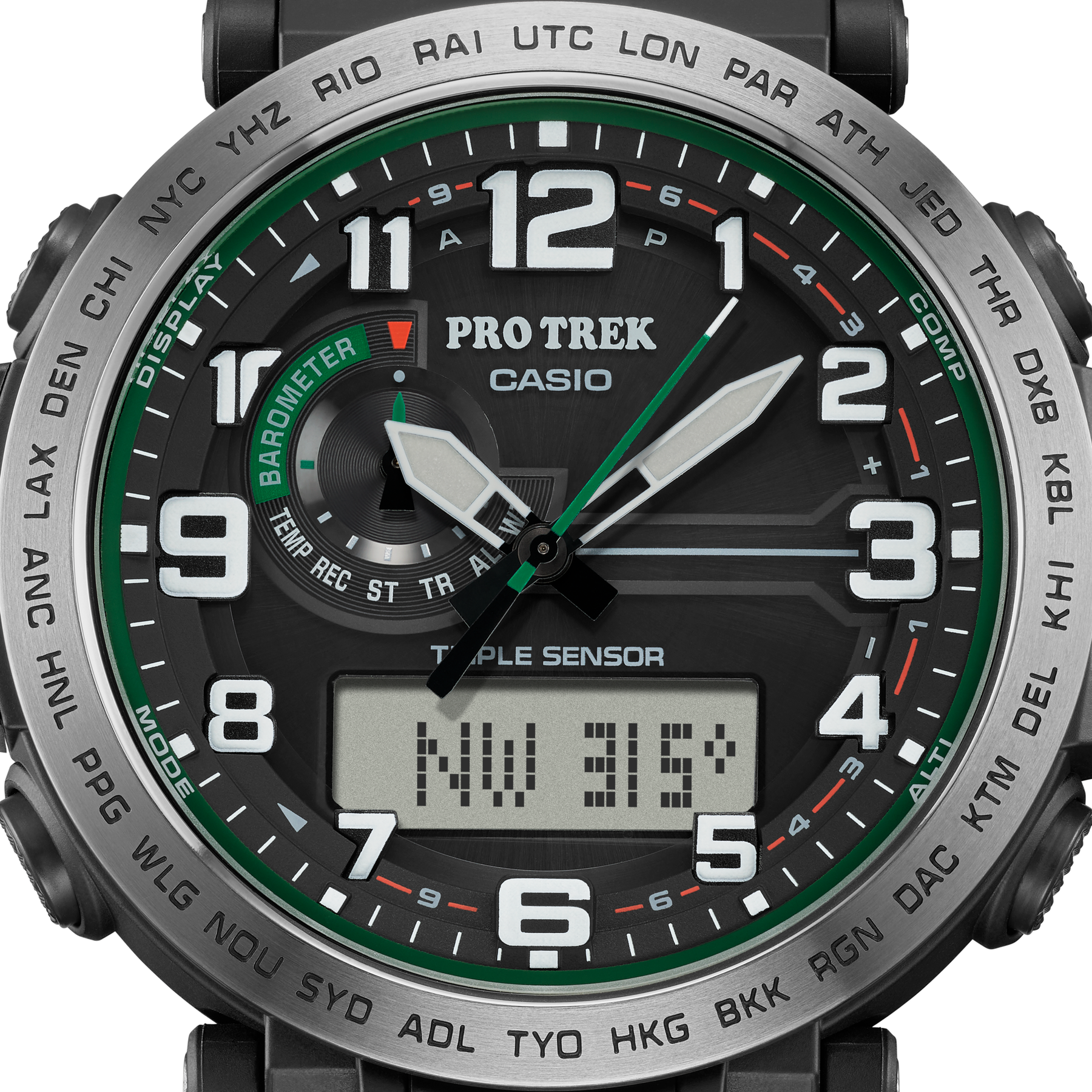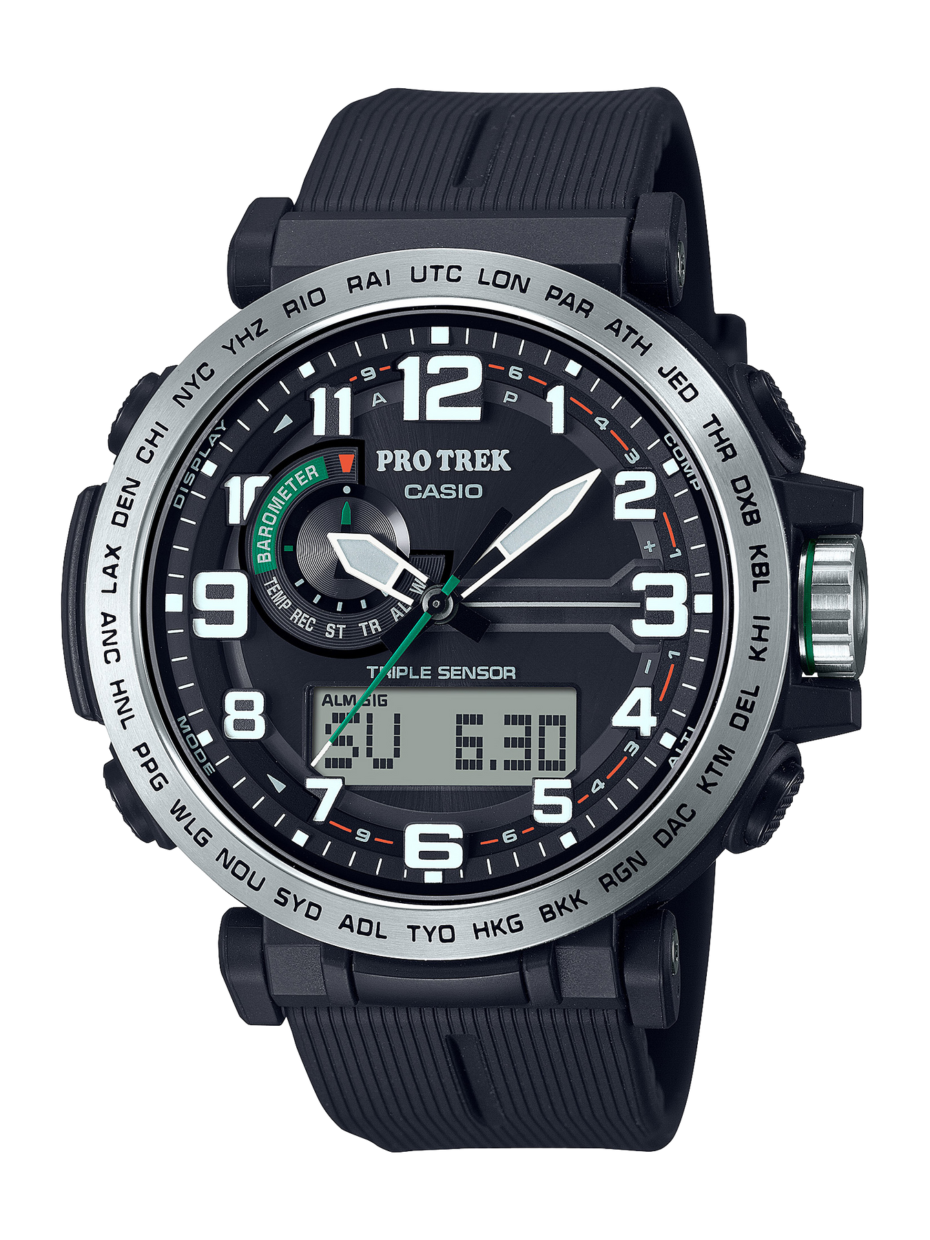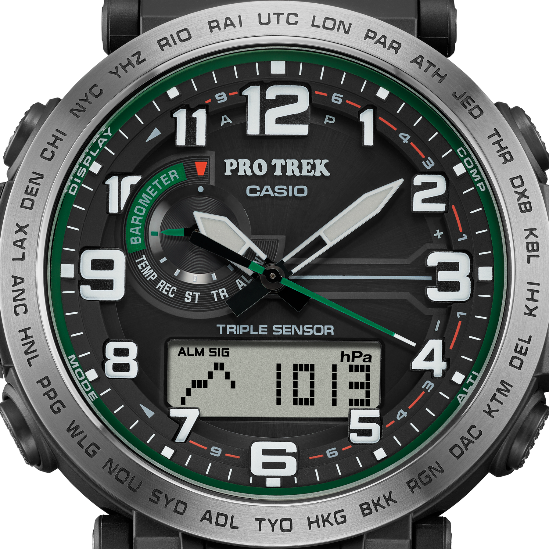 Regular timekeeping: Analog: 3 hands (hour, minute (hand moves every 10 seconds), second) Digital: Hour, minute, second, am/pm, date, day