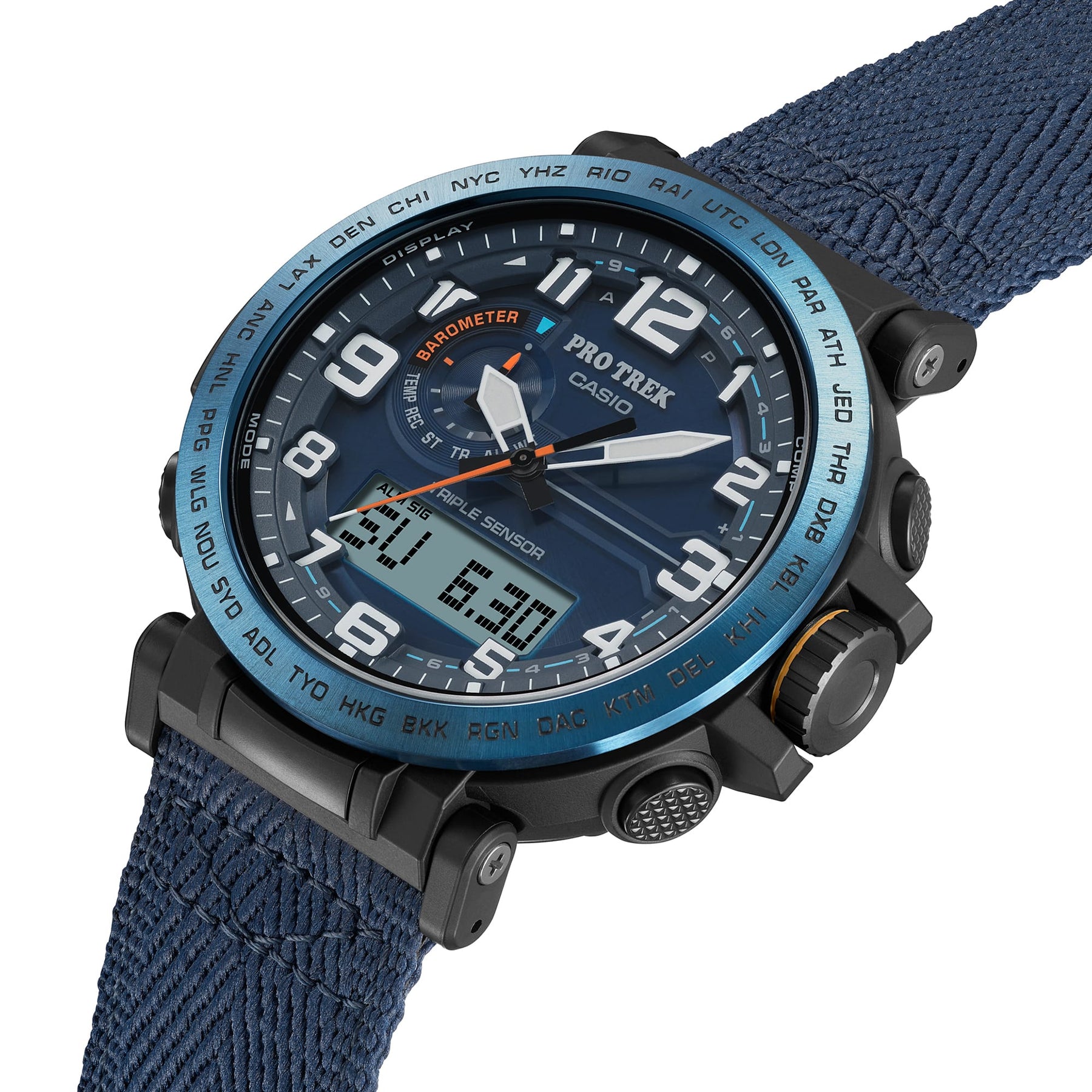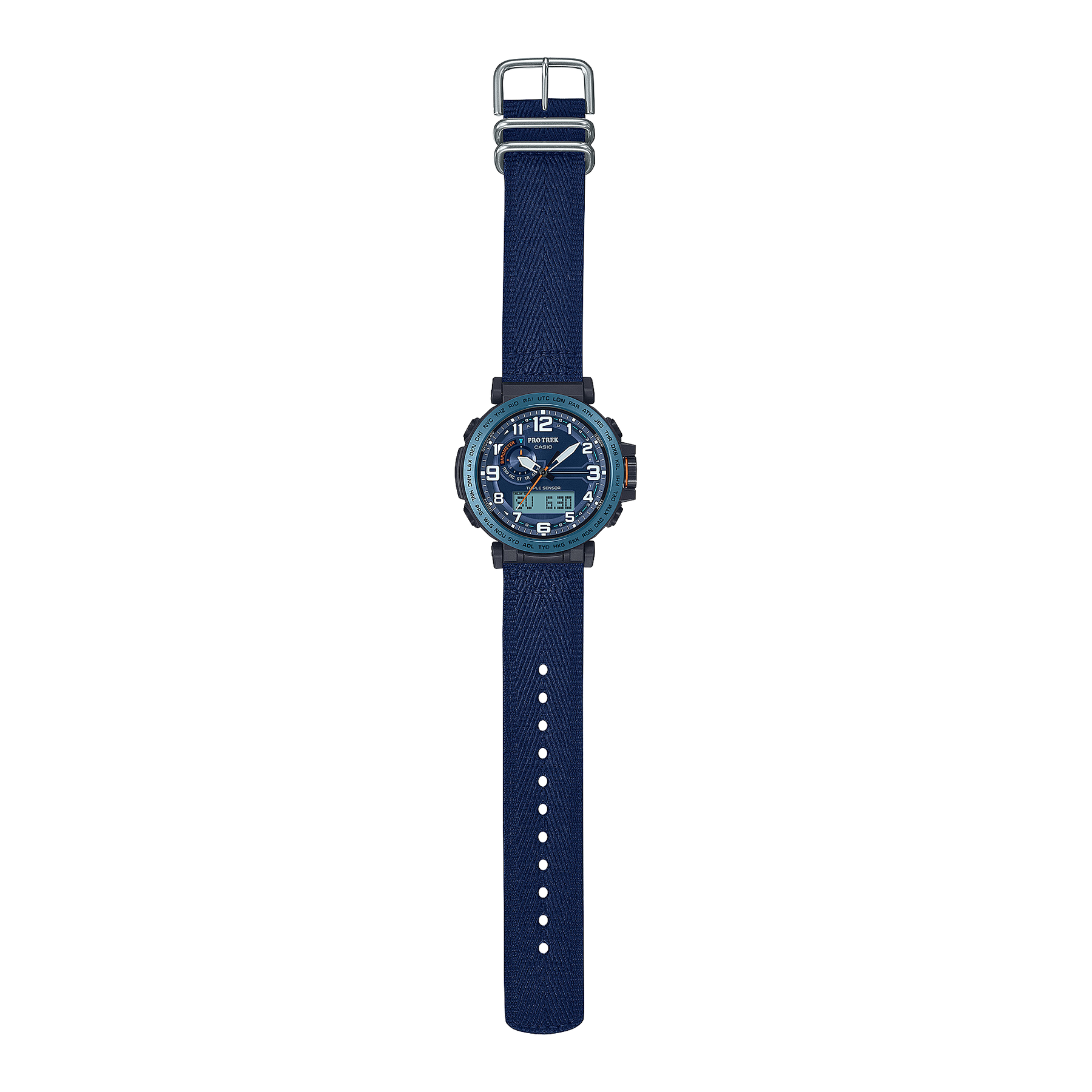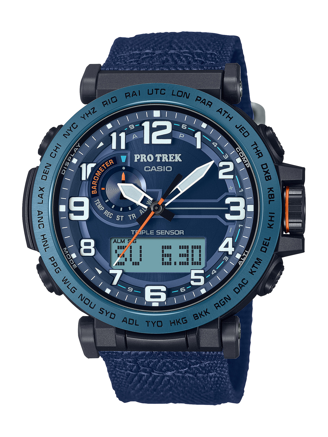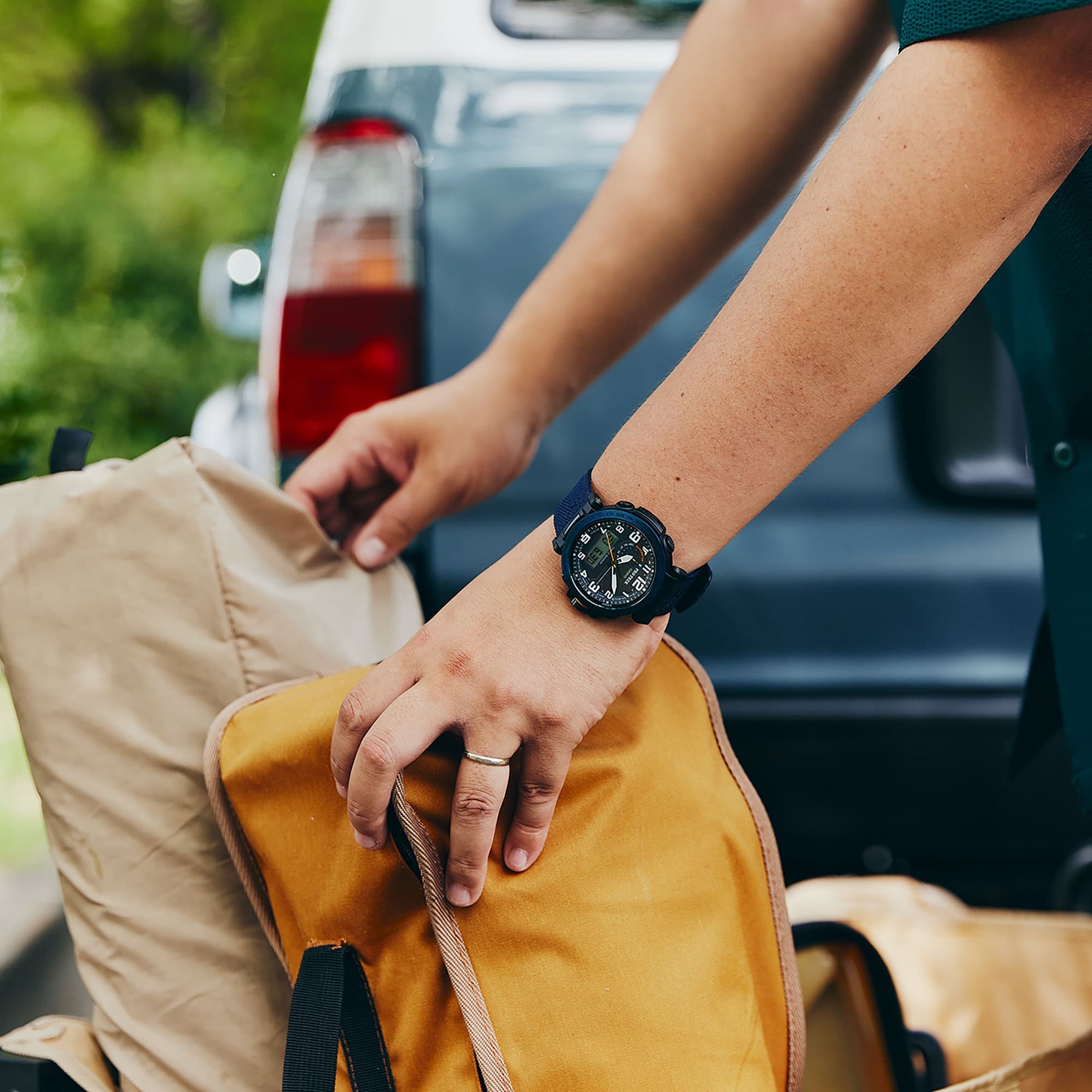 Go bold. Explore the great outdoors! Get the PRO TREK PRG-601YB with cloth band, featuring materials expected to reduce environmental impact and big bold index numbers for an easy read.