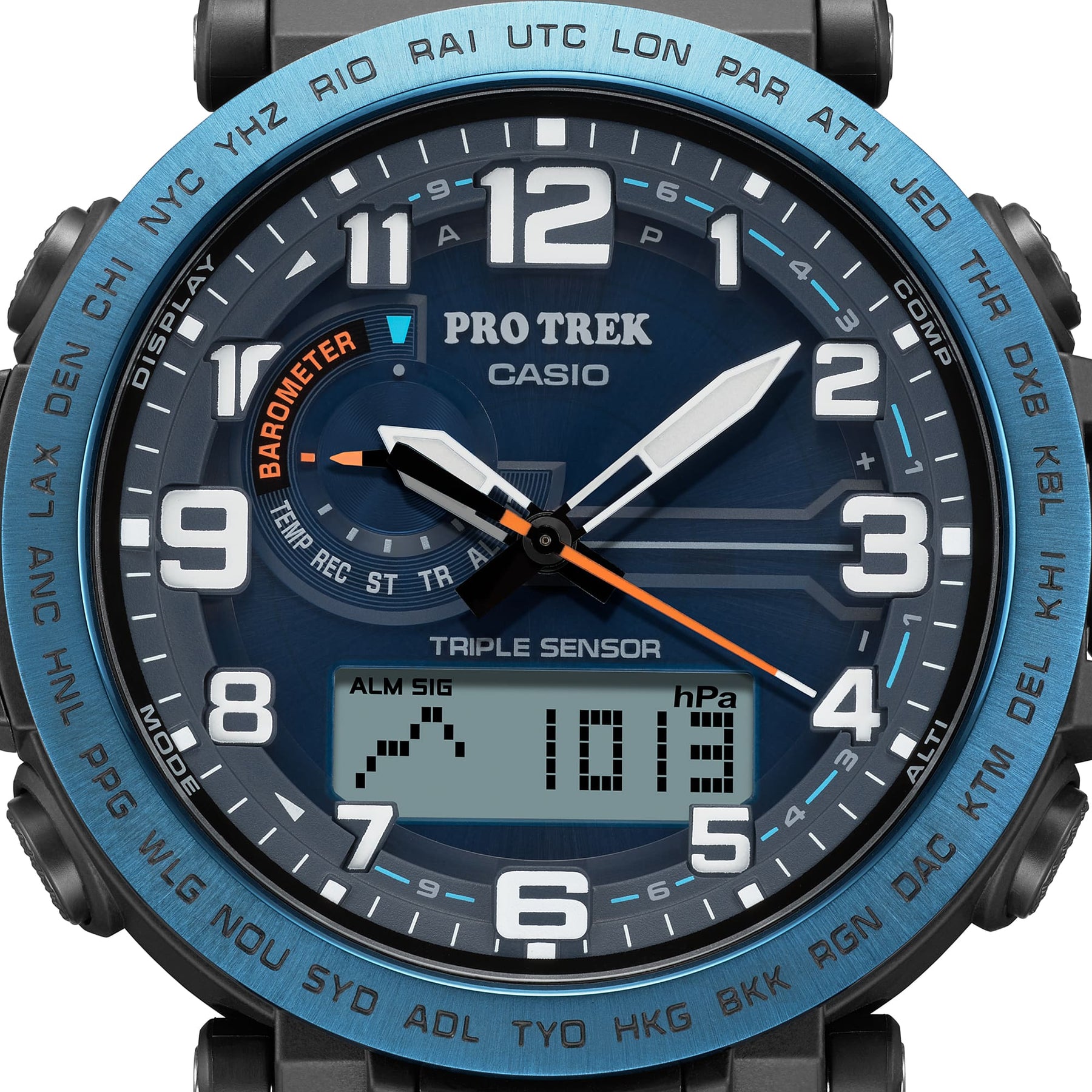 The digital compass, barometer/altimeter, and thermometer Triple Sensor helps you stay on top of changes in the natural environment, while Tough Solar converts light into the energy needed to power the watch.