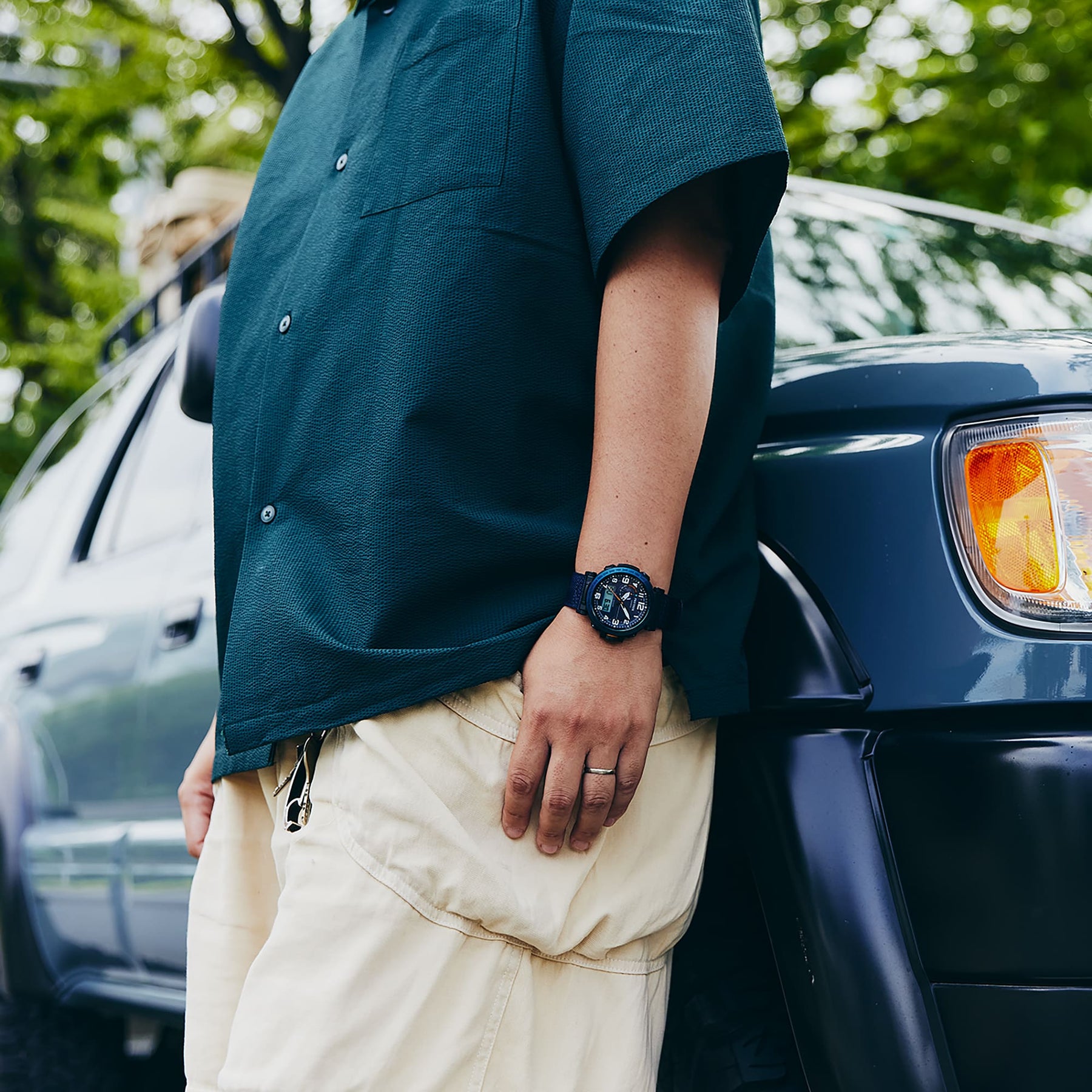 The raised index numbers on the dial are boldly balanced with a wide ion-plated stainless steel bezel. The resin components used for the case and case back are made with bio-based resin materials, and the cloth band is made with materials from recycled plastic bottles. These materials are expected to reduce the ecological footprint of this watch. Combining a simple watch aesthetic with the toughness of authentic outdoor gear, this timepiece has your back whether you’re in town or out in the wilderness.