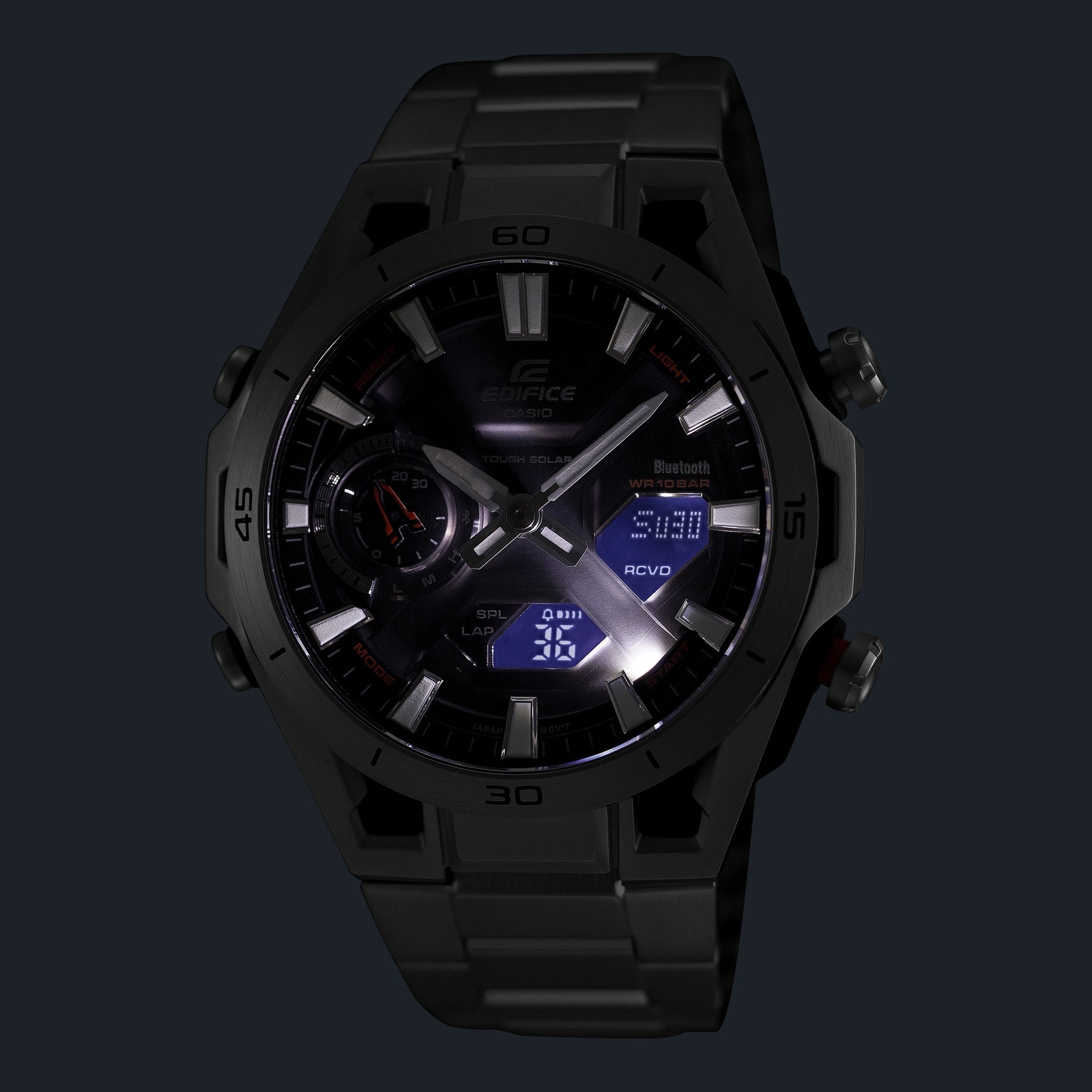 More than just a stylish presence, the EDIFICE ECB-2300 SOSPENSIONE delivers full-on functionality, as well. Smartphone pairing via Bluetooth® delivers automatic time correction and makes it easy to configure world time and other functions from the app. With Tough Solar for stable operation of functions, scratch-resistant sapphire crystal, practical 100-meter water resistance and more, you’ll be at peak performance.